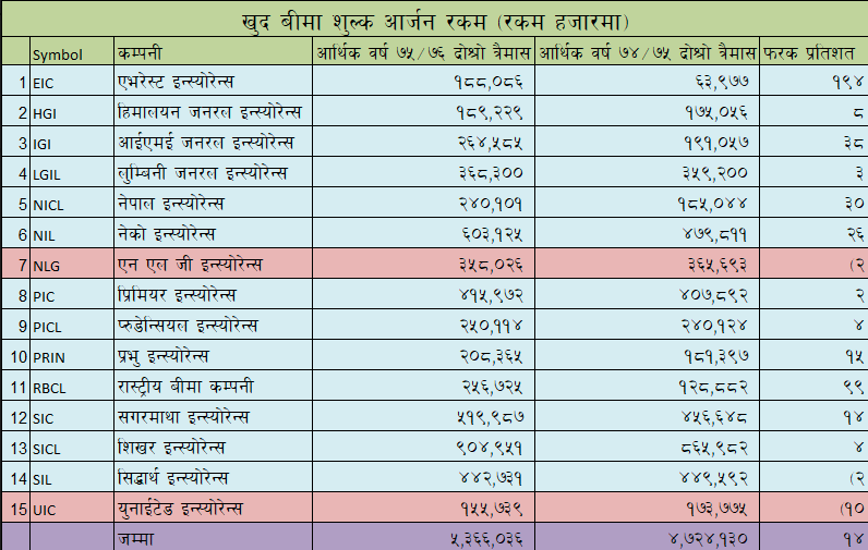 नेपाल स्टक एक्सेञ्जमा सुचिकृत १५ निर्जीवन बीमा कम्पनीहरुले आर्थिक वर्ष ७५/७६ को दोस्रो त्रैमासको वित्तिय विवरण प्रकाशन गरिसकेको अवस्था छ।