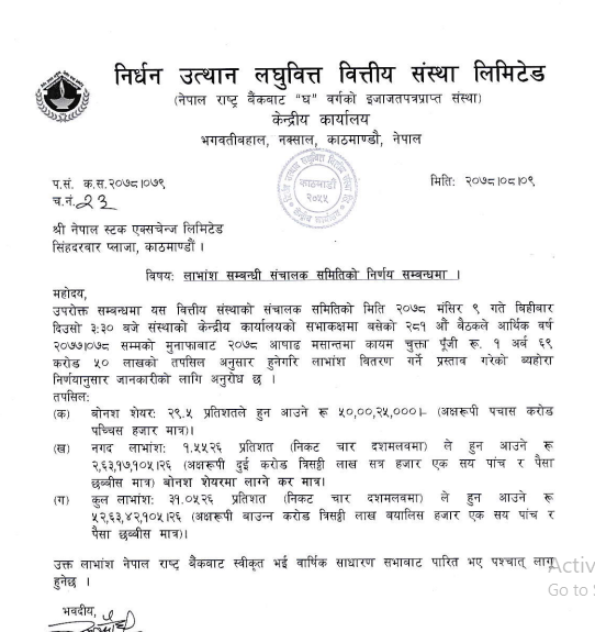 निर्धन उत्थान लघुवित्तको लाभांश घोषणा, कति दिँदैछ बोनश ?