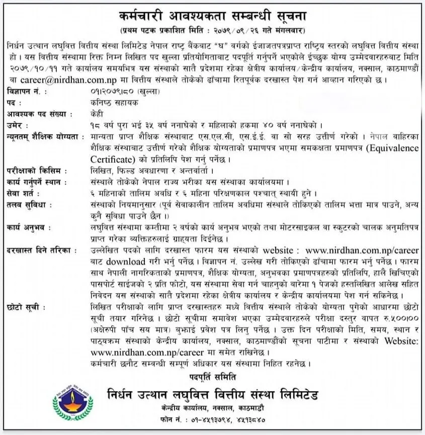 काठमाडौं । निर्धन उत्थान लघुवित्त वित्तीय संस्था लिमिटेडले कर्मचारी माग गरेको छ । संस्थाले संस्थाले कनिष्ठ सहायक पदमा केहि संख्यामा कर्मचारी माग गरेको छ । उक्त पदमा आवेदन दिनको लागि एसएससी तह उत्तिर्ण गरेको हनुपर्नेु जनाएको छ । इच्छुक उम्मेदवारले सुचना प्रकाशित भएको मितिले १५ दिनभित्र अर्थात भोलि माघ ९ गतेभित्र आवेदने दिनुपर्नेछ ।