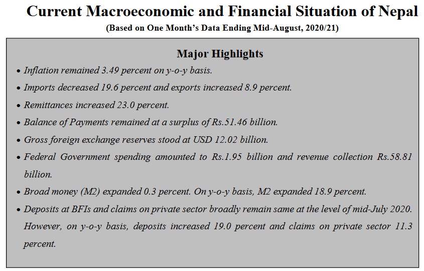 कोरोना महामारीका बीचमा भारतमा २३ प्रतिशतभन्दा बढि अर्थतन्त्रमा गिरावट आएको सन्दर्भमा नेपालमा भएको यो सुधारलाई चमत्कारिक सुधारको रुपमा आर्थिक विश्लेषकहरुले औल्याएका छन् । साथै रेमिट्यान्स २३ प्रतिशतले बृद्धि भएको छ भने भुक्तानी सन्तुलन ५१ अर्ब धनात्मक हुन पुगेको छ । त्यस्तै विदेशी मुद्रा संचिती १४ खर्ब भन्दा माथि पुग्नुलेको देशको आर्थिक अवस्था अन्त्यै सबल र बलियो अवस्थामा पुगेको देखिएको छ ।