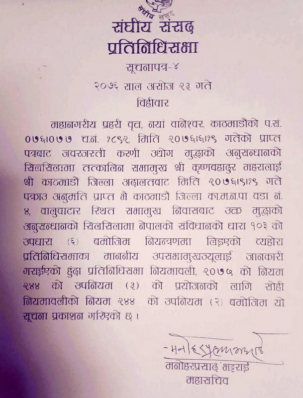 महासचिव भट्टराईले बिहिबार सूचना जारी गर्दै महराको सांसद पद निलम्बन भएको उल्लेख गरेका छन् । संसद सचिवालयद्वारा बिहिवार जारी सूचनमा भनिएको छ, ‘महानगरीय प्रहरी वृत, नयाँ बानेश्वर, काठमाडौंको गत असोज १९ गतेको प्राप्त पत्रबाट जबरजस्ती करणी उद्योग मुद्दाको अनुसन्धानको सिलसिलामा तत्कालीन सभामुख कृष्णबहादुर महरालाई काठमाडौं जिल्ला अदालतबाट गत असोज १९ गते पक्राउ अनुमति प्राप्त भई काठमाडौं–४, बालुबाटारस्थित सभामुख निवासबाट उक्त मुद्दाको अनुसन्धानको सिलसिलामा नेपालको संविधानको धारा १०३ को उपधारा ६ बमोजिम नियन्त्रणमा लिइएको व्यहोरा प्रतिनिधिसभाका माननीय उपसभामुखलाई जानकारी गराइएको हुँदा प्रतिनिधिसभा नियमावली २०७५ को नियम २४४ को उपनियम ३ को प्रयोजनको लागि सोही नियमावलीको नियम २४४ को उपनियम २ बमोजिम यो सूचना प्रकाशित गरिएको छ,’ सूचनामा भनिएको छ । सो धारामा सांसदको पद निलम्वन हुने व्यवस्थाबारे उल्लेख छ ।