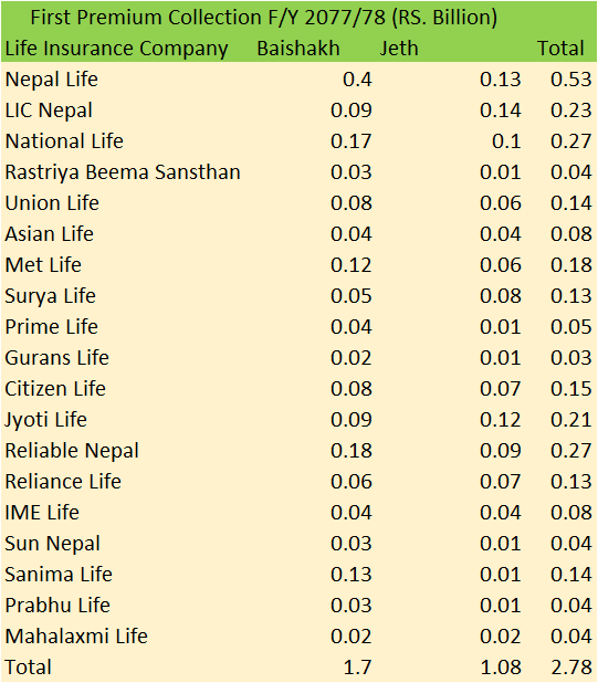 यस अवधिमा लाइफ इन्स्योरेन्स कर्पोरेसनले २३ करोड, ज्योति लाइफले २१ करोड, मेट लाइफले १८ करोड, सिटिजन लाइफले १५ करोड, युनियन लाइफले १४ करोड, सानिमा लाइफले १४ करोड, सूर्या लाइफले १३ करोड, रिलायन्स लाइफले १३ करोड, एशियन लाइफले ८ करोड, आइएमई लाइफले ८ करोड, प्राइम लाइफले ५ करोड, राष्ट्रिय बीमा संस्थानले ४ करोड, सन नेपाल, प्रभु लाइफ, महालक्ष्मी लाइफले ४ करोड रुपैयाँ र गुराँस लाइफले तीन करोड रुपैयाँ बीमा शुल्क आर्जन गरेका छन् ।