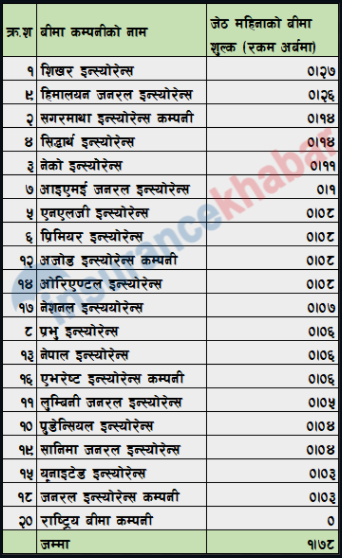 समितिको तथ्याङक अनुसार जेठ महिनामा नेशनल इन्स्योरेन्स कम्पनीले ७ करोड प्रभु इन्स्योरेन्स कम्पनीले ६ करोड, नेपाल इन्स्योरेन्स कम्पनीले ६ करोड, एभरेष्ट इन्स्योरेन्स कम्पनीले ६ करोड, लुम्बिनी जनरल इन्स्योरेन्स कम्पनीले ५ करोड प्रुडेन्सियल इन्स्योरेन्स कम्पनीले ४ करोड, सानिमा जनरल इन्स्योरेन्स कम्पनीले पनि ४ करोड, यूनाइटेड इन्स्ययोरेन्स कम्पनीले ३ करोड र जनरल इन्स्योरेन्स कम्पनीले ३ करोड रुपैयाँ बीमा शुल्क आर्जन गर्न सफल भएका छन् ।