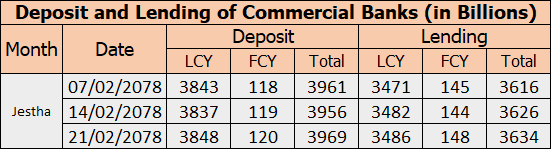 बैंशाख पहिलो साता कर्जा विस्तार ऋणात्मक देखिए पनि दोस्रो सातेदेखि भने लगातार बढिरहेको छ । जेठ तेस्रो सातासम्ममा बैंकहरुले ३९ खर्ब ६९ अर्ब रुपैयाँले निक्षेप संकलन भएको छ ।