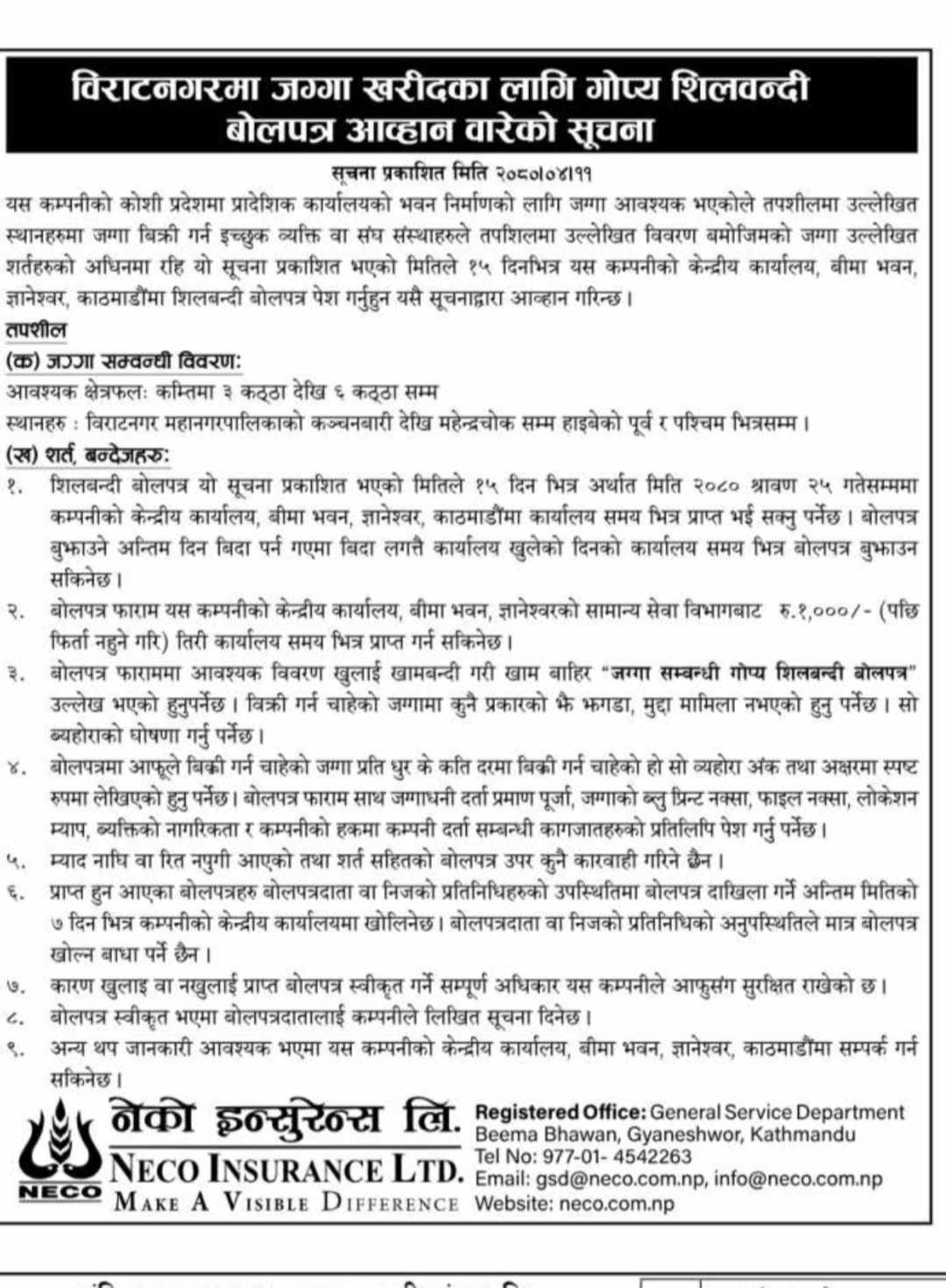 कम्पनीले प्रकाशन गरेकाे सूचनामा ३ देखि ६ कठ्ठा क्षेत्रफल जग्गा खरिद गर्न इच्छुक रहेकाे उल्लेख छ। साउन २५ गतेसम्ममा इच्छुक जग्गाधनीले कम्पनीकाे ज्ञानेश्वरस्थित प्रधान कार्यालयमा शिलबन्दी बाेलपत्र पेश गर्नुपर्नेछ। कञ्चनबारीदेखि महेन्द्रचाेक सम्म राजमार्गकाे पूर्व वा पश्चिम भित्रसम्मकाे जग्गा प्रस्ताव गर्नुपर्ने शर्त रहेकाे छ।