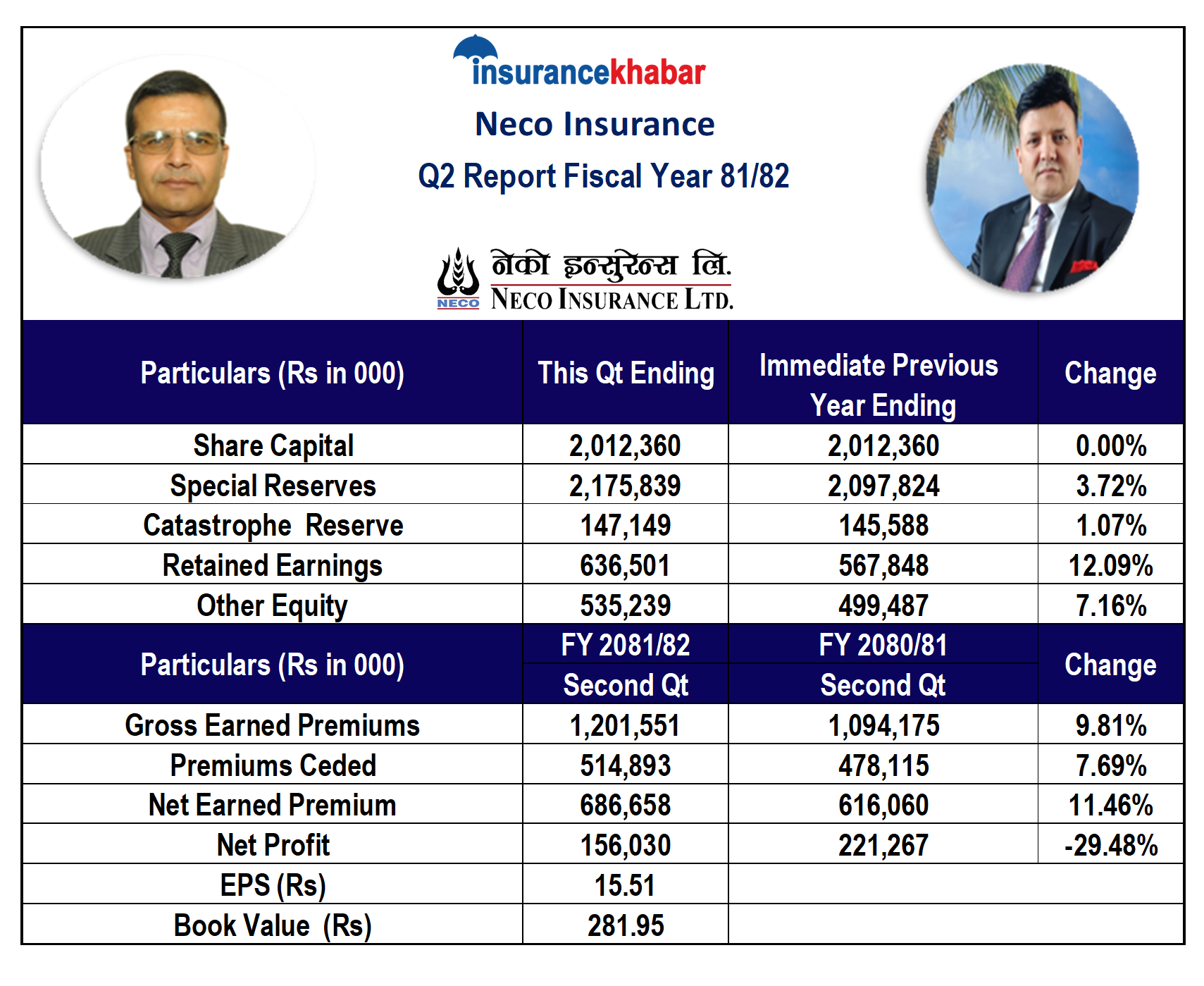काठमाडौं । नेको इन्स्योरेन्स कम्पनीले चालु आर्थिक वर्षको दोस्रो त्रैमास (साउन–पुससम्मको अपरिष्कृत वित्तीय विवरण सार्वजनिक गरेको छ । कम्पनीले प्रकाशन गरेको वित्तीय विवरण अनुसार कम्पनीको नाफा घटेको छ । खुद बमिाशुल्क र कुल बीमाशुल्क आर्जन बढेको छ ।