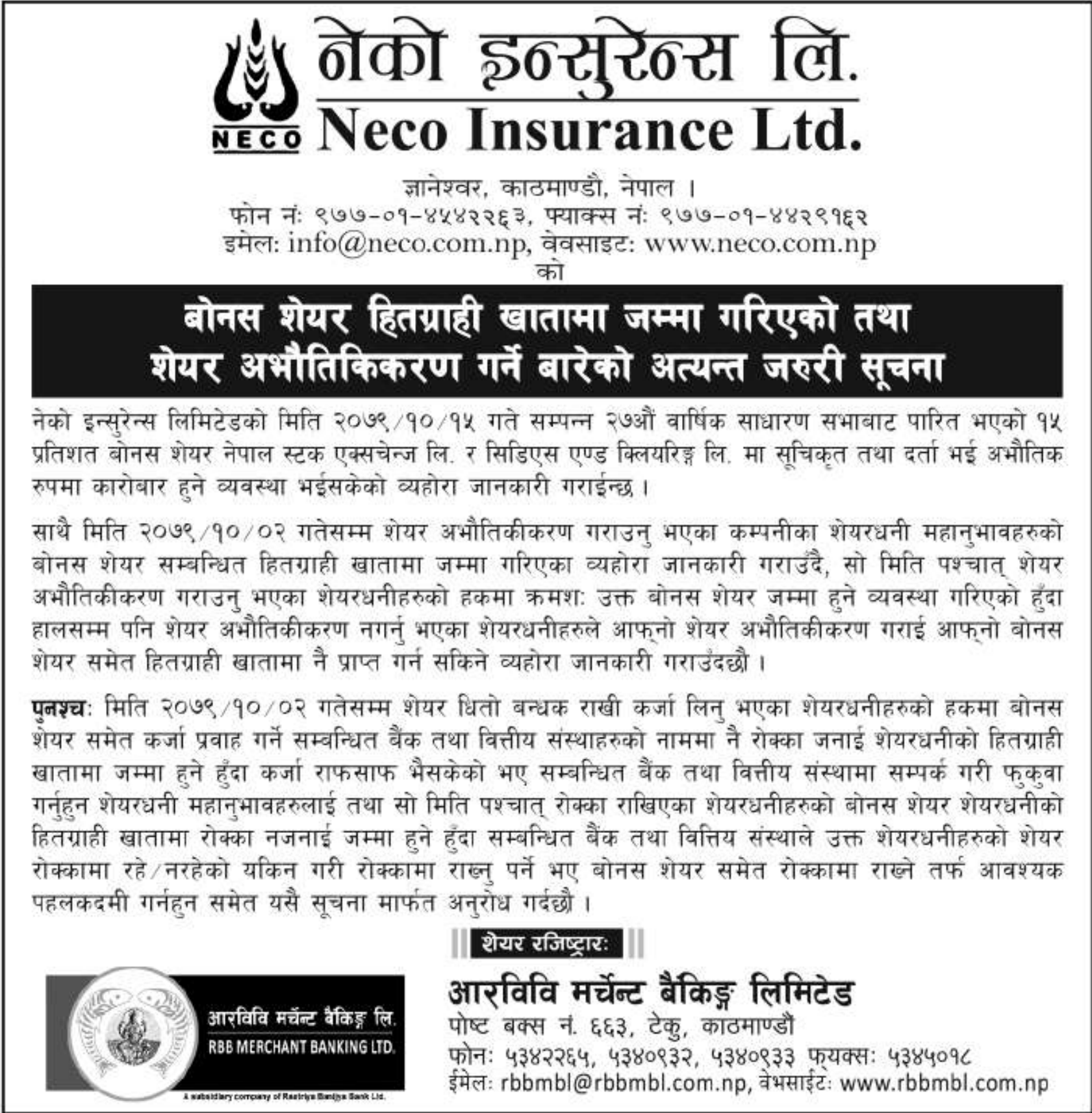 कम्पनीले वार्षिक साधारण सभा सम्पन्न भएको दुई महिनाभित्र बोनश शेयर धितोपत्र दोस्रो बजारमा सूचिकृत गराई सम्बन्धित शेयरधनीहरूको हितग्राही खातामा जम्मा गरेको जनाएको छ । हालसम्म पनि हितग्राही खाता नखोलेका सदस्यहरूको हकमा भने खाता खोलेपछि जम्मा गरिने कम्पनीले बताएको छ ।