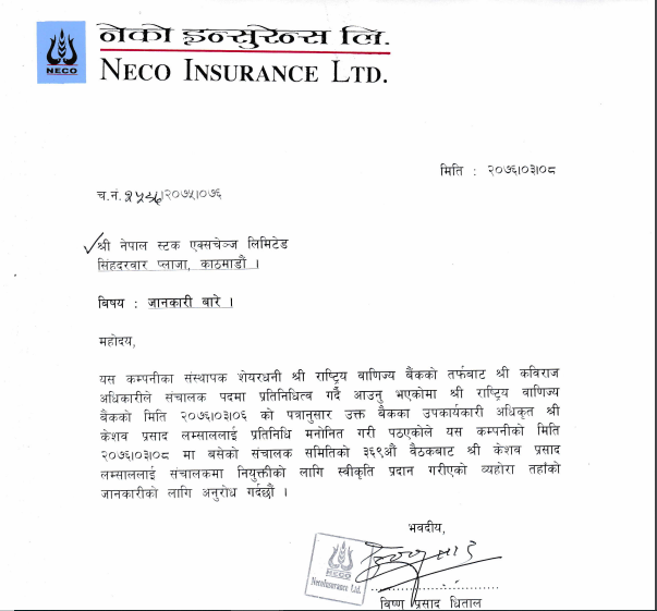 नेको इन्स्योरेन्स कम्पनीको संचालक समितिमा केशव प्रसाद लम्साल नियुक्त भएका छन् । बैंकको असार ६ गतेको पत्रअनुसार सोही बैंकका उपकार्यकारी अधिकृत केशव प्रसाद लम्साललाई मनोनित गरी पठाएकाले कम्पनीले उनलाई नियुक्त गरेको हो ।