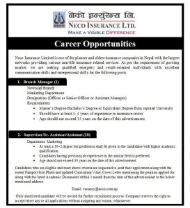 काठमाडौं । नेको इन्स्योेरेन्स लिमिटेडले ठूलो संख्यामा कर्मचारीको माग गरेको छ । नेकोले ब्रान्च म्यानेजरदेखि सुपरभाइजर, सुपरभाइजर असिस्टेनसम्मको पदका लागि कर्मचारीको माग गर्दै सूचना जारी गरेको छ ।