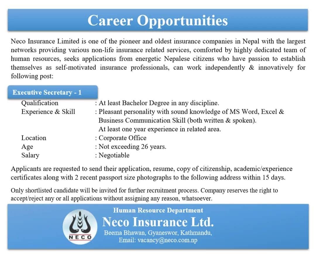 काठमाडौं । नेको इन्स्योरेन्स कम्पनीले कर्मचारीको माग गरेको छ । कम्पनीले एक्जुकेटिभ सेक्रेटरीका लागि कर्मचारीको माग गरेको हो । उक्त पदका लागि कम्पनीले स्नातक वा स्नाकोत्तर गरेको हुनुपर्ने जनाएको छ । कम्पनीले आफ्नो कर्पोरेट अफिसका लागि कर्मचारीको माग गरेको हो । ईच्छुक तथा योग्यता पुगेकाले सुचना प्रकाशित भएको मितिले १५ दिनभित्र आवेदन दिनुपर्नेछ ।