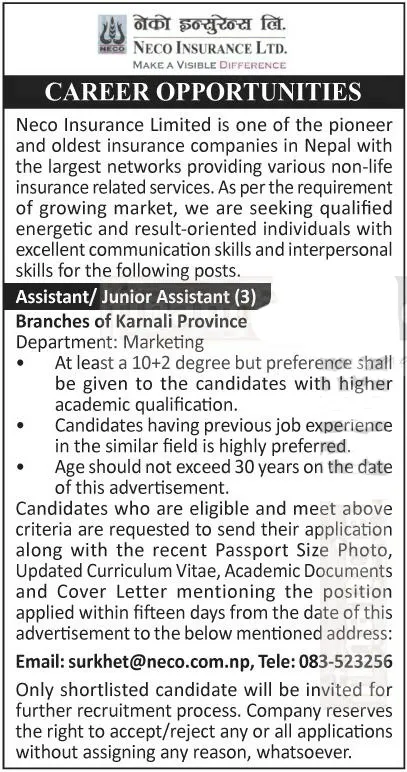 काठमाडौं । नेको इन्स्योरेन्स कम्पनी लिमिटेडले कर्मचारी माग गरेको छ । कम्पनीले एसिस्टेन्ट, जुनियर एसिस्टेन्ट पदका लागि ३ जना कर्मचारी माग गरेको हो । कम्पनीले कर्णाली प्रदेशका विभिन्न शाखा कार्यालयका लागि कर्मचारीको माग गरेको हो । उक्त पदमा आवेदन दिनको लागि मान्यता प्राप्त शैक्षिक संस्थाबाट प्लस टु तह उत्तिर्ण गरेको हुनुपर्ने जनाएको छ । ईच्छुक तथा योग्यता पुगेका उम्मेदवारले कम्पनीको इमेल मार्फत सुचना प्रकाशित भएको मितिले १५ दिन अर्थात चैत ३० गतेसम्म आवेदन दिन सक्नेछन् ।