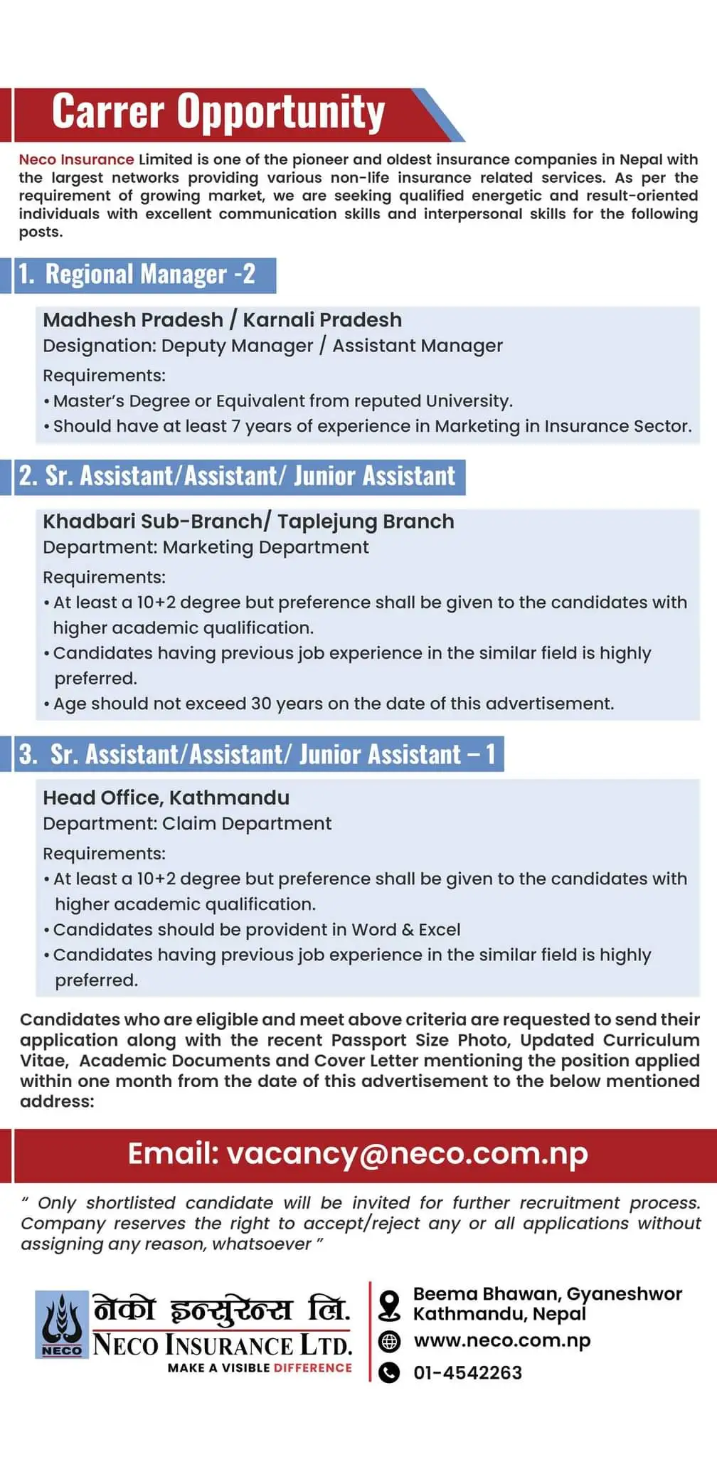 काठमाडौं । नेको इन्स्योरेन्स कम्पनीले विभिन्न पदका लागि कर्मचारीको माग गरेको छ । कम्पनीले रिजनल म्यानेजरका लागि २ जना, सिनियर असिस्टेन्ट, असिस्टेन्ट र जूनियर असिस्टेन्टमा विभिन्न ब्रान्चका लागि केही, सिनियर असिस्टेन्ट, असिस्टेन्ट र जूनियर असिस्टेन्टमा हेड अफिसका लागि कर्मचारीको माग गरेको हो ।