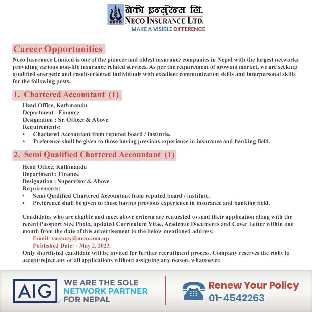 कम्पनीले आफ्नो केन्द्रिय कार्यालयको लागि कर्मचारी माग गरेको जनाएको छ । उक्त पदहरुमा आवेदन दिनका लागि मान्यता प्राप्त शिक्षण संस्थाबाट पढेको हुनुपर्नेछ । ईच्छुक तथा योग्यता पुगेका उम्मेदवारले आवश्यक कागजात संकलन गरी इन्स्योरेन्सको इमेल मार्फत सुचना प्रकाशति भएको मितिले १ महिनाभित्र अर्थात जेठ १९ गतेभित्र आवेदन दिन सक्नेछन् ।