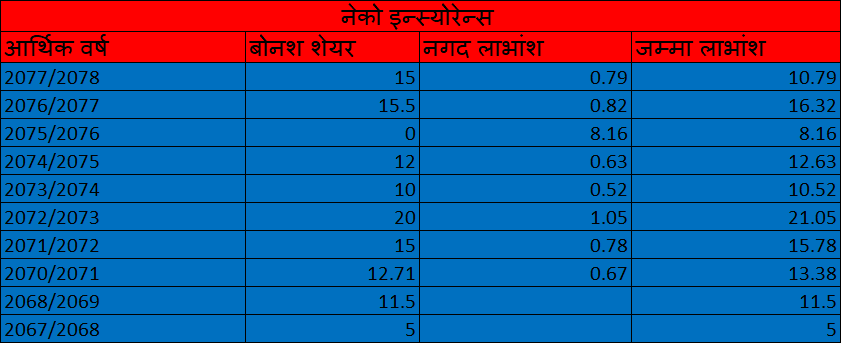 प्रस्तावित बोनश शेयर तथा नगद लाभांश बीमा समितिको स्वीकृति एवं आगामी साधारणसभाबाट पारित भएपश्चात वितरण गरिने कम्पनीले जनाएको छ । कम्पनीको हालको चुक्ता पूँजी एक अर्ब ५२ करोड रुपैयाँ रहेको छ । प्रस्तावित लाभांश वितरण पछि चुक्ता पूँजी एक अर्ब ७४ करोड रुपैयाँ पुग्नेछ ।