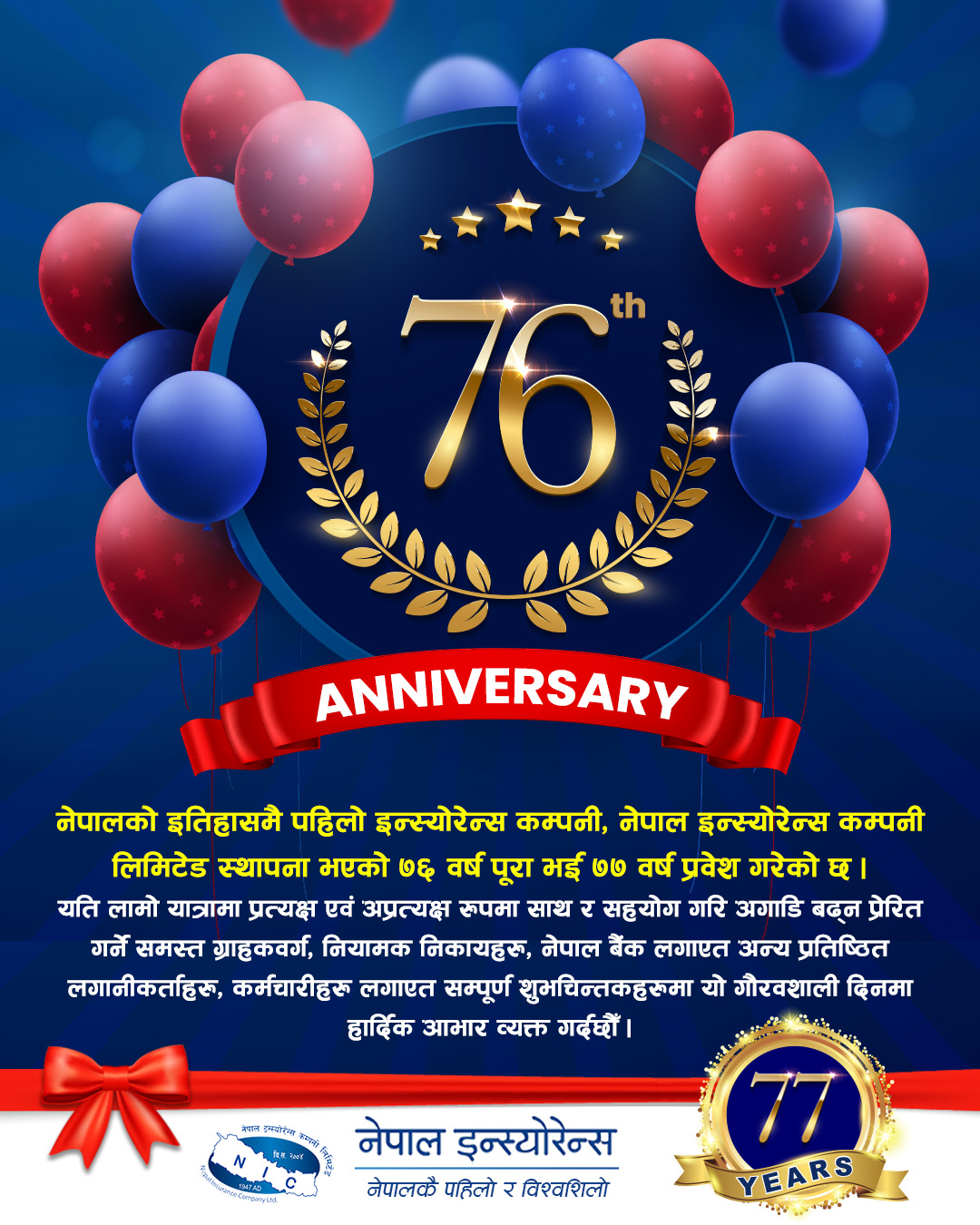 काठमाडौं । नेपालकै पहिलो इन्स्योरेन्स कम्पनी नेपाल इन्स्योरेन्स कम्पनी नेपाल इन्स्योरेन्स कम्पनी लिमिटेड स्थापना भएको ७६औं वर्ष पूरा भई ७७औं वर्ष प्रवेश गरेको छ। सोही अवसरमा कम्पनीले संस्थालाई निरन्तर साथ र सहयोग गरि अगाडि बढ्न प्रेरित गर्ने समस्त ग्राहकवर्ग, नियामक निकायहरु, प्रतिष्ठित लगानीकर्ताहरु, कर्मचारीहरु लगाएत सम्पूर्ण शुभचिन्तकहरुमा आज विशेष दिनको उपलक्ष्यमा हार्दिक आभार व्यक्त गरेको छ ।