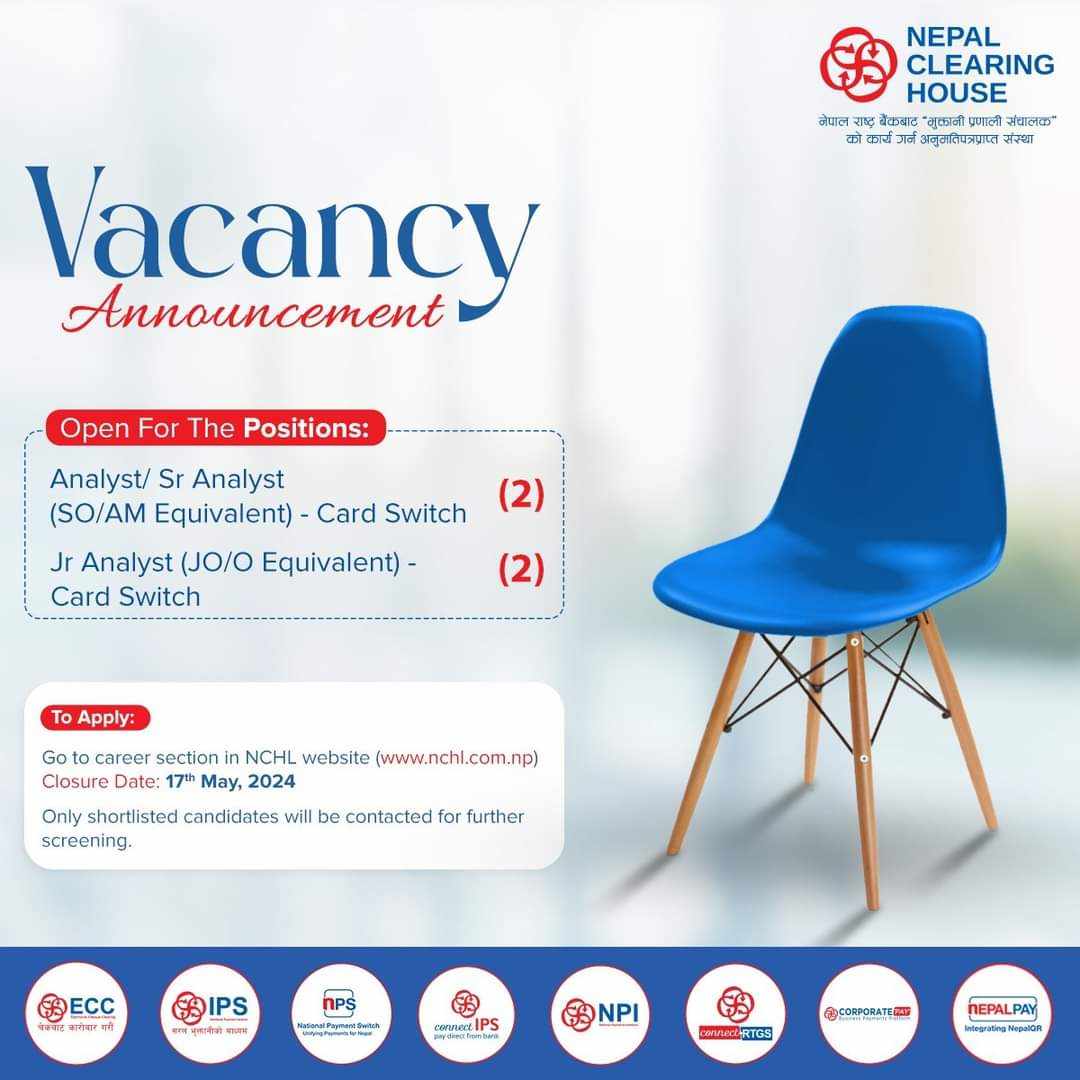 काठमाडौं । नेपालमा क्लियरिङ हाउस लिमिटेडले कर्मचारी माग गरेको छ । कम्पनीले एनालिस्ट, सिनियर एनालिास्ट, कार्ड स्वीचका लागि २ जना र जूनियर एनालिस्ट कार्ड स्वीचका लागि २ जना गरी कुल ४ जना कर्मचारी माग गरेको हो । ईच्छुक तथा योग्यता पुगेकाले १७ मेसम्म आवेदन दिन सकिनेछ ।