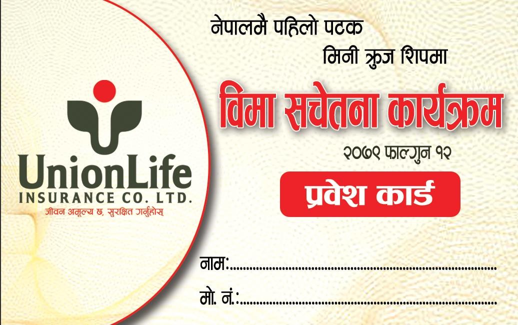 काठमाडौं । यूनियन लाइफ इन्स्योरेन्स कम्पनीले नेपालमै पहिलो पटक मिनी क्रुज शिपमा बीमा सचेतना कार्यक्रम सम्पन्न गरेको छ । कम्पनीले फागुन १२ गते बागमती प्रदेश सांसद उत्तम जोशीको उपस्थितिमा नेपालमै पहिलो पटक पानि माथि यस्तो कार्यक्रम आयोजना गरेको हो ।