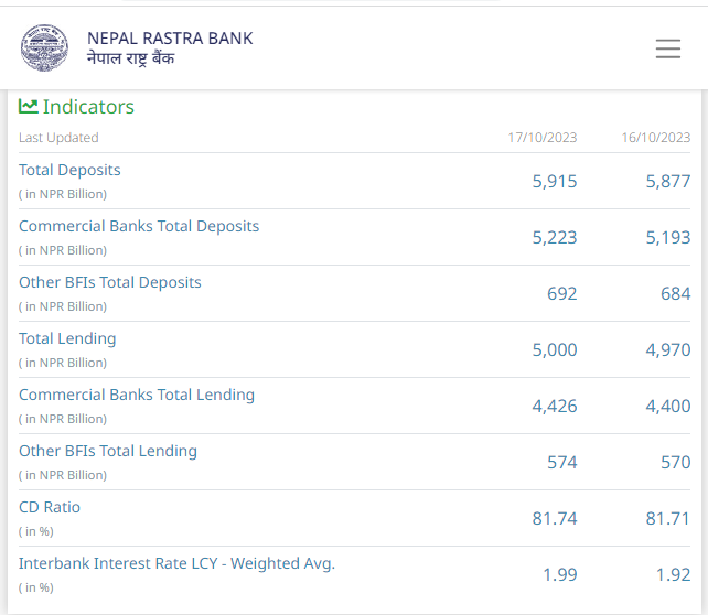 कर्जासँगै निक्षेप पनि वृद्धि भएको छ । असोज २९ गते ५८ खर्ब ७७ अर्ब रहेको निक्षेप असोज ३० गते ५९ खर्ब १५ अर्ब पुगेको छ ।