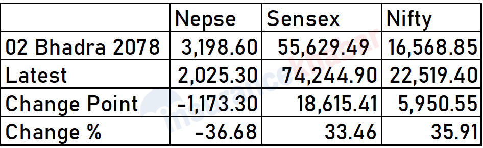 पछिल्लो कारोबार दिनको तथ्यांकलाई आधार मान्दा सेन्सेक्स ७४ हजार २४४ दशमलव ९० को विन्दुमा बन्द भएको छ भने निफ्टी २२ हजार ५१९ दशमलव ४० को विन्दुमा बन्द भएको छ । नेपालको शेयर बजार अल टाइम हाई पुगेको दिन सेन्सेक्स ५५ हजार ६२९ दशमलव ४९ विन्दुमा थियो भने निफ्टी १६ हजार ५६८ दशमलव ८५ विन्दुमा बन्द भएको थियो ।