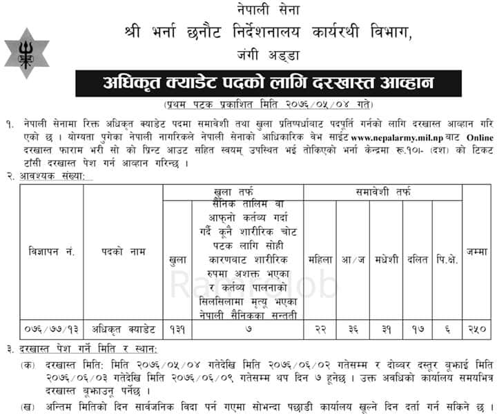 सेनालेको अधिकृत क्याडेट पदको लागि खुल्ला तर्फ १३१ र ७ गरी १३८ त्यस्तै समावेशी तर्फ महिला २२, आदिवासी जनजाति ३६, मधेसी ३१, दलित १७, पिछडिएको क्षेत्र ६ गरी जम्मा २५० जनाको कोटा खुलाएको सूचना मार्फत जानकारी दिएको हो ।