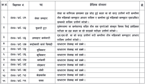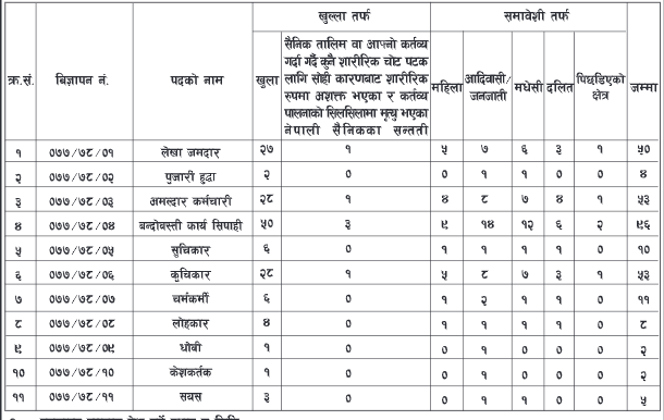 सेनाले लेखा जमदार, पुजारी, अमल्दार, बन्दोबस्ती कार्य सिपाही, सूचीकर, कुचिकार, चर्मकर्मी, लोहकार, धोबी, केशकर्तक र शयेश पदको लागि कर्मचारी माग गरेको हो । जसमध्ये सेनाले बन्दोबस्ती कार्य सिपाहीमा ९६ जना माग गरेको छ।
