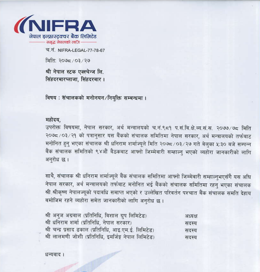 कम्पनीको परिवर्तन भएको सञ्चालक समितिमा अनुज अग्रवाल अध्यक्ष र सदस्यहरुमा धनिराम शर्मा,चन्द्र प्रसाद ढकाल र लालमणि जोशी रहेको कम्पनीले एक सुचना जारी गर्दै जनाएको छ ।