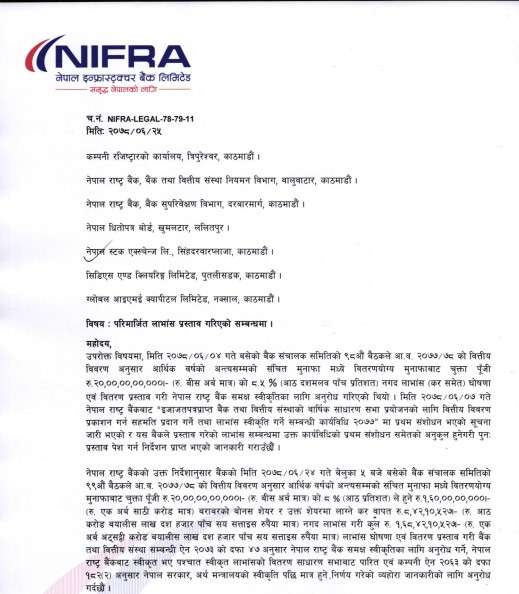 बैंकले यस अघि आर्थिक वर्ष ७७/७८ को मुनाफाबाट हाल कायम चुक्ता पूँजी ८ दशमलव ५ प्रतिशतले हुन आउने नगद लाभांश बितरण गर्ने प्रस्ताव गरेको थियो । तर अब भने बैंकले बोनश शेयर पनि प्रस्ताव गरेको छ ।