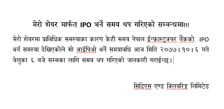 मेरो शेयरमा सीडीएस एन्ड क्लियरिङले एक सूचना जारी गर्दै यस्तो जानकारी दिएको हो । समय लम्याएर साँझ ६ बजेसम्म पराएको सीडीएस एन्ड क्लियरिङले जनाएको छ।यस अघि आईपिओमा आवेदन दिने समय ५ बजेसम्म रहेपनि सिस्टममा समस्या आएकोले सिडीएसले आवेदन दिने समय १ घण्टा थप गरेको हो ।
