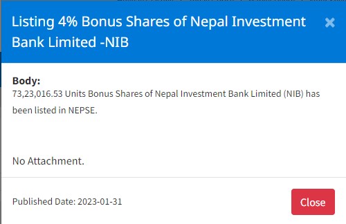 काठमाडौं । नेप्सेमा नेपाल इन्भेष्टमेण्ट बैंकको बोनश शेयर सूचिकृत भएको छ । कम्पनीको ७३ लाख २३ हजार १६ दशमलव ५३ कित्ता बोनश शेयर सूचीकृत भएको हो । कम्पनीले पुस ७ गते सम्पन्न वार्षिक साधारण सभाबाट पारित ४ प्रतिशत बोनश शेयर सूचिकृत गराएको हो ।