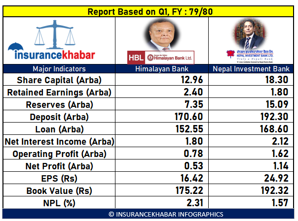 हिमालयन बैंकले चालु आवको प्रथम त्रैमाससम्म ७८ करोड संचालन नाफा गर्दा नेपाल इन्भेष्टमेण्ट बैंकले १ अर्ब ६२ करोड संचालन नाफा गरेको छ।