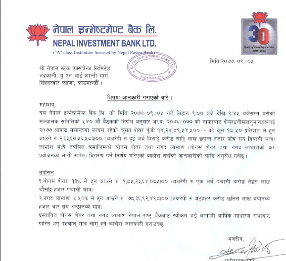 काठमाडौं । नेपाल इन्भेष्टमेन्ट बैंकले १८ दशमलव ५० प्रतिशत लाभांश दिने घोषणा गरेको छ । बैंकको आइतबार सम्पन्न संचालक समिति बैठकले गत वर्षको मुनाफाबाट १३ प्रतिशत बोनस सेयर र ५ दशमलव ५० प्रतिशत नगद लाभांश दिने निर्णय गरेको हो ।