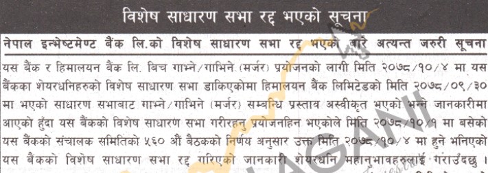 काठमाडौं । नेपाल इन्भेष्टमेन्ट बैंकको विशेष साधारणसभा रद्द भएको छ । हिमालयन बैंकको पुस ३० गते सम्पन्न साधारणसभाले मर्जर प्रस्ताव अस्वीकृत गरेपछि इन्भेष्टमेन्ट बैंकले विशेष साधारणसभा रद्द गरेको हो।