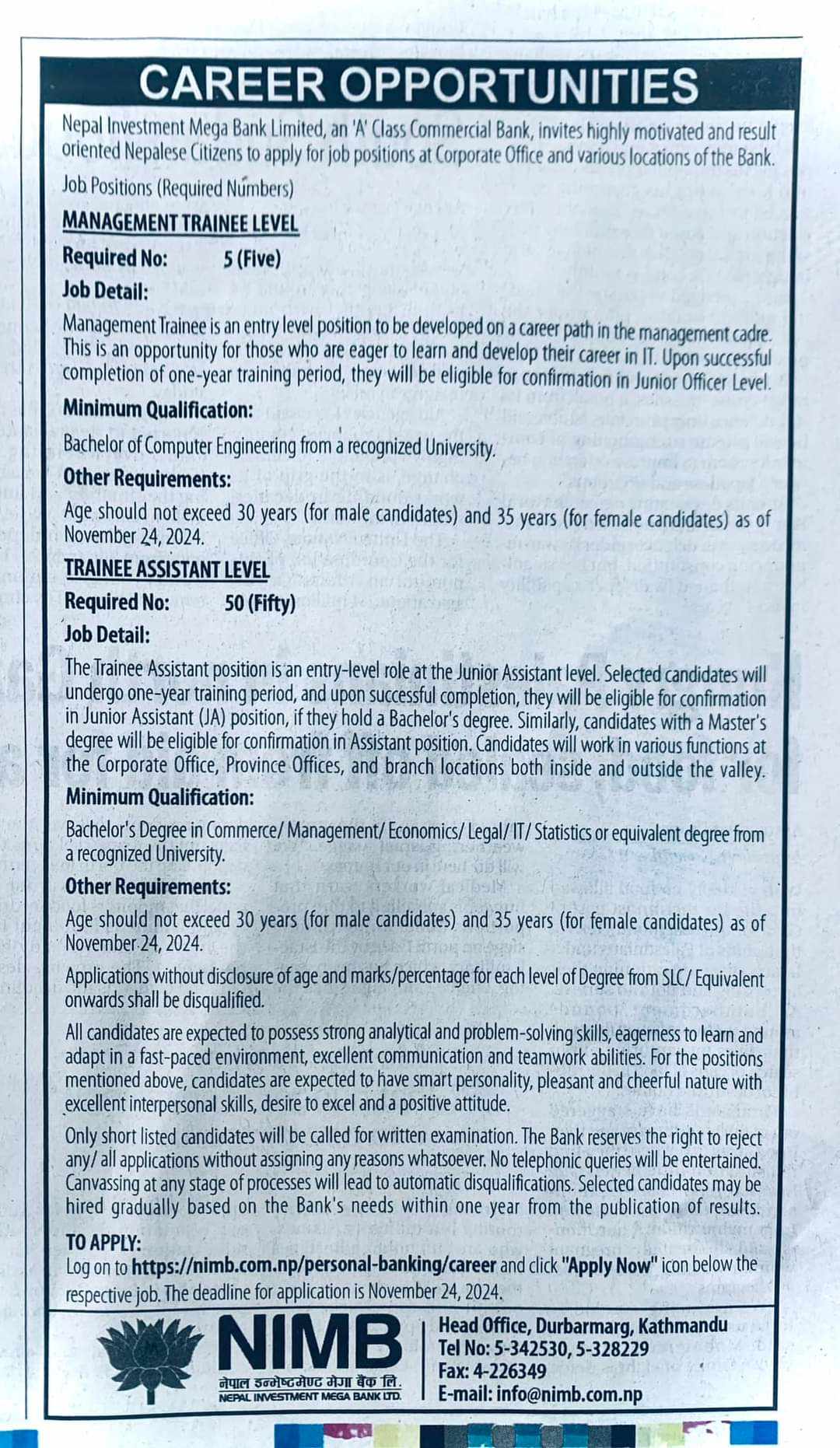 नेपाल इन्भेष्टमेन्ट मेगा बैंकले माग्यो धेरै कर्मचारी, आवेदन दिन २ दिन बाँकि