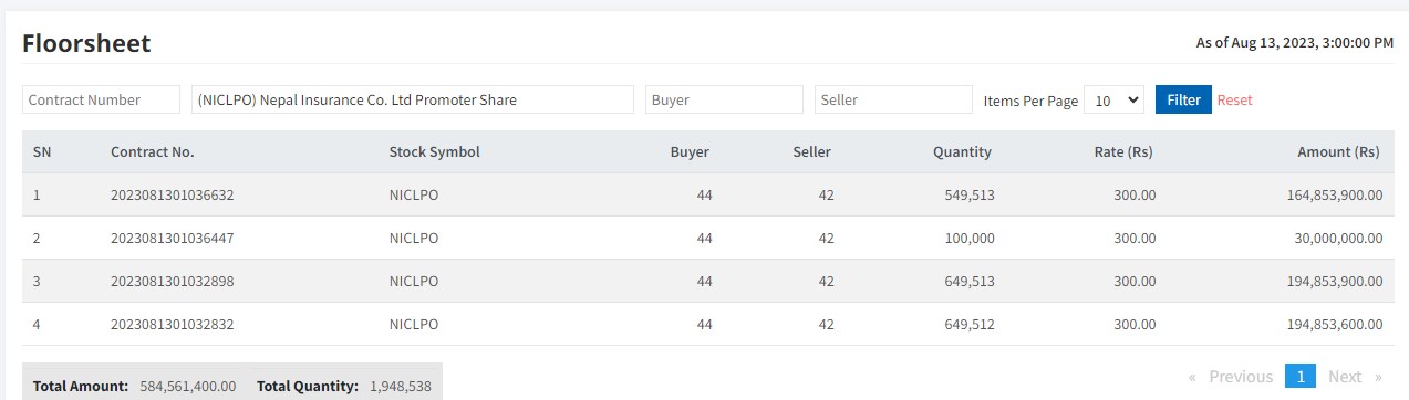 नेपाल इन्स्याेरेन्समा रहेकाे आइएमई लिमिटेड, आइएमई हाेल्डिङ्गस प्रालि र आइएमई इन्भेष्टमेण्ट प्रालिले संस्थापक शेयर बिक्री गरेका हुन् । आज कारोवार भएको १९,४८,५३८ कित्ता शेयर मध्ये १८,४८,५३८ कित्ता शेयर एशियन लाइफ इन्स्योरेन्स र बाँकी १ लाख कित्ता शेयर गुहेश्वरी मर्चेन्ट बैङ्किङ्ग एण्ड फाइनान्स कम्पनीले खरिद गरेको हो। प्रति कित्ता ३०० रुपैयाँमा कारोबार भएको शेयरको कुल खरिद बिक्रि ५८ करोड ४५ लाख रुपैयाँमा भएको नेप्सेले जनाएको छ। सनी सेक्युरिटीज ब्रोकर नम्बर ४२ मार्फत उक्त सेयर बिक्री भएको छ भने डाइनामिक मनि मार्केट ब्रोकर नम्बर ४४ बाट सेयर खरिद भएको छ ।
