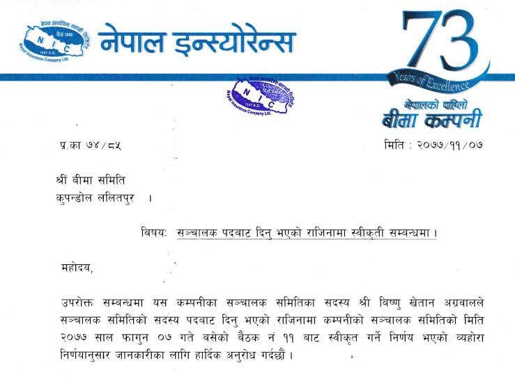 काठमाडौं । नेपाल इन्स्योरेन्स कम्पनीका संचालक समितिका सदस्य विष्णु खेतान अग्रवालले राजिनामा दिएका छन् । कम्पनीको संचालक समितिको फागुन ७ गते बसेको संचालक समितिको बैठकले अग्रवालको राजिनामा स्वीकृत गर्ने निर्णय गरेको हो ।