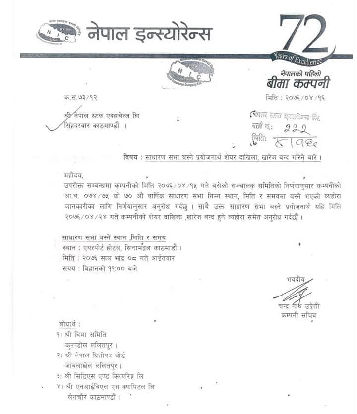नेपाल इन्स्योरेन्सले भदौ ८ गते ७० औं वार्षिक साधारण सभा गर्ने भएकोे छ । कम्पनीको बुधबार (साउन १५ गते) बसेको सञ्चालक समितिको बैंठकले भदौ ८ गते साधारण सभा गर्ने निर्णय गरेको हो । साधारण सभा कार्की एयरपोर्ट होटल सिनामंगल काठमाडौंमा बिहान ११ बजे सुरु हुनेछ ।