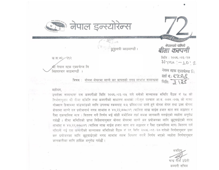 नेपाल इन्स्योरेन्सले घोषणा गरेको ७.५ प्रतिशत बोनस सेयरको कर प्रयोजनार्थ वितरण गर्ने भनिएको नगद लाभांश बीमा समितिबाट अस्वीकृत भएको छ ।