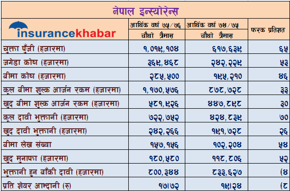 नेपाल इन्स्योरेन्सले आर्थिक वर्ष ७५/७६ को चौथो त्रैमासको वित्तिय विवरण सार्वजनिक गरेको छ। कम्पनीको खुद नाफा ५२ प्रतिशतले वृद्धि हुँदै १८ करोड ५ लाख पुगेको छ।