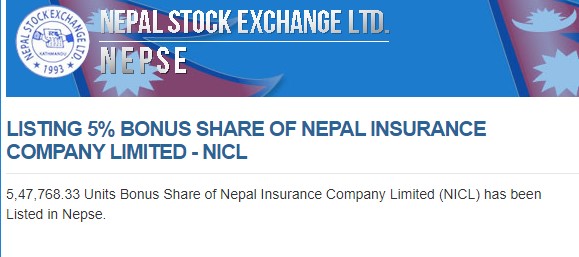काठमाडौं । नेपाल स्टक एक्सचेञ्ज (नेप्से)मा नेपाल इन्स्योरेन्सको बोनस शेयर सूचीकृत भएको छ ।कम्पनीको पाँच लाख ४७ हजार ७६८ दशमलव ३३ कित्ता बोनस शेयर सूचीकृत भएको हो ।