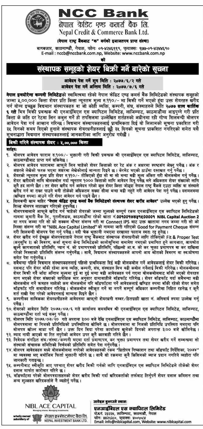काठमाडौं । नेपाल क्रेडिट एण्ड कमर्स बैंक लिमिटेडले बिक्री गर्न लागेको संस्थापक समूहको शेयर आजबाट विक्री खुल्ला भएको छ । नेपाल इन्स्योरेन्स कम्पनी लिमिटेडको स्वामित्वमा रहेको एनसीसी बैंकको ५ लाख कित्ता शेयर प्रति कित्ता न्यूनतम मूल्य १ सय १० रूपैयाँमा बिक्री गर्न लागेको जनाएको छ ।