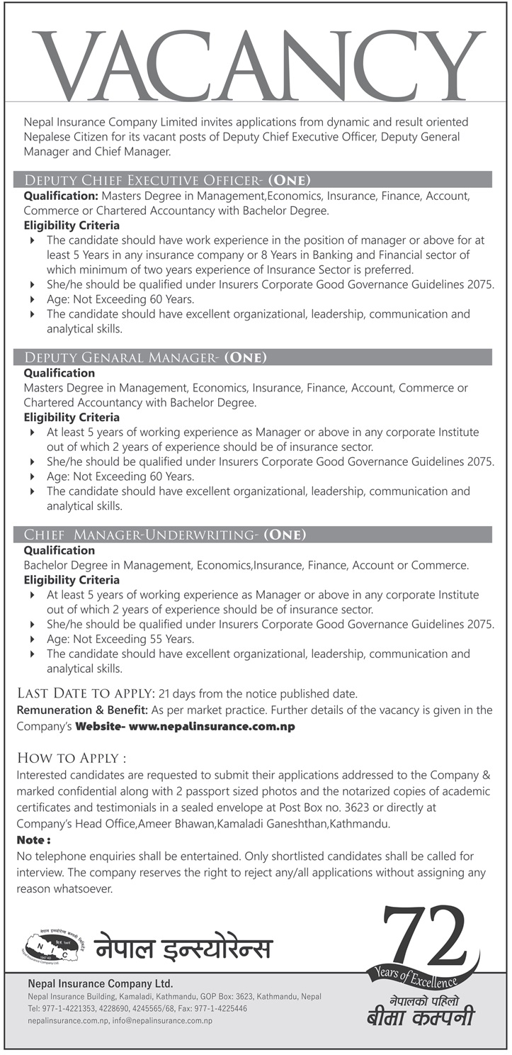 नेपाल इन्स्योरेन्स कम्पनीले विभिन्न पदका लागि कर्मचारी आहवान गरेको छ । कम्पनीले डेपुटी सिइओ, डेपुटी जनरल म्यानेजर, चिफ म्यानेजर अण्डर राइटर पदका लगि कर्मचारीहरुको माग गरेको हो ।