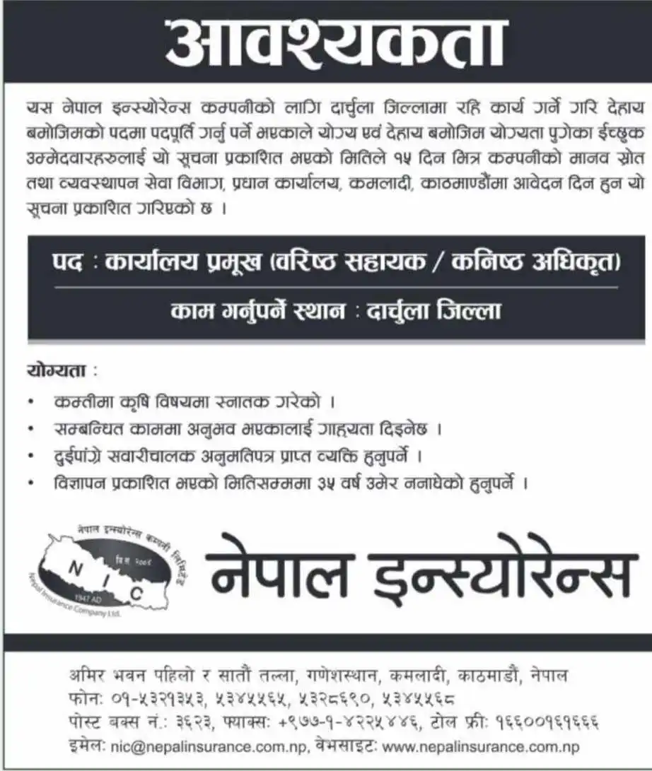 ठमाडौं । नेपाल इन्स्योरेन्स कम्पनी लिमिटेडले माग गरेको कर्मचारीका लागि दरखास्त दिन ५ दिन बाँकी रहेको छ । कम्पनीले सुदुरपश्चिम प्रदेशको दार्चुला जिल्लामा काम गर्ने कार्यालय प्रमुखमा वरिष्ठ सहायक र कनिष्ठ अधिकृतका लागि कर्मचारी माग गरेको हो ।