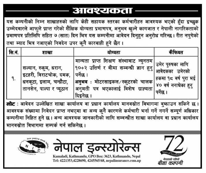 नेपाल इन्स्योरेन्सले माग्यो १२ शाखा कार्यालयका लागि कर्मचारी