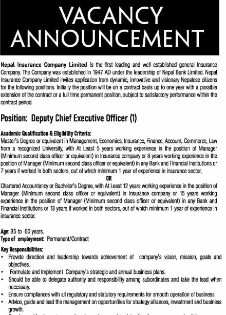 काठमाडौं । नेपाल इन्स्योरेन्स कम्पनीले दुई पदका लागि कर्मचारीको माग गरेको छ । कम्पनीले डेपुटी सिईओ तथा डेपुटी जनरल म्यानेजरका लागि कर्मचारीको माग गरेको छ ।