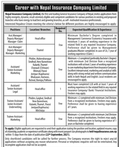 काठमाडौं । नेपाल इन्स्योरेन्स कम्पनीले विभिन्न पदका लागि कर्मचारीको माग गरेको छ । कम्पनीले असिस्टेन्ट म्यानेजर, डेपुटी म्यानेज र म्यानेजर क्लेमका लागि केही, असिस्टेन्ट म्यानेजर, डेपुटी म्यानेज र म्यानेजर मार्केटिङका लागि केही, असिस्टेन्ट,सिनियर असिस्टेन्ट मार्केटिङका लागि केही, सस्टेन्ट,सिनियर असिस्टेन्ट लेगलका लागि १ जना, ट्रेनी असिस्टेन्ट, जुनियर असिस्टेन्ट अण्डरराइटिङका लागि केही र ट्रेनी असिस्टेन्ट मार्केटिङका लागि केही संख्यामा कर्मचारीको माग गरेको छ ।