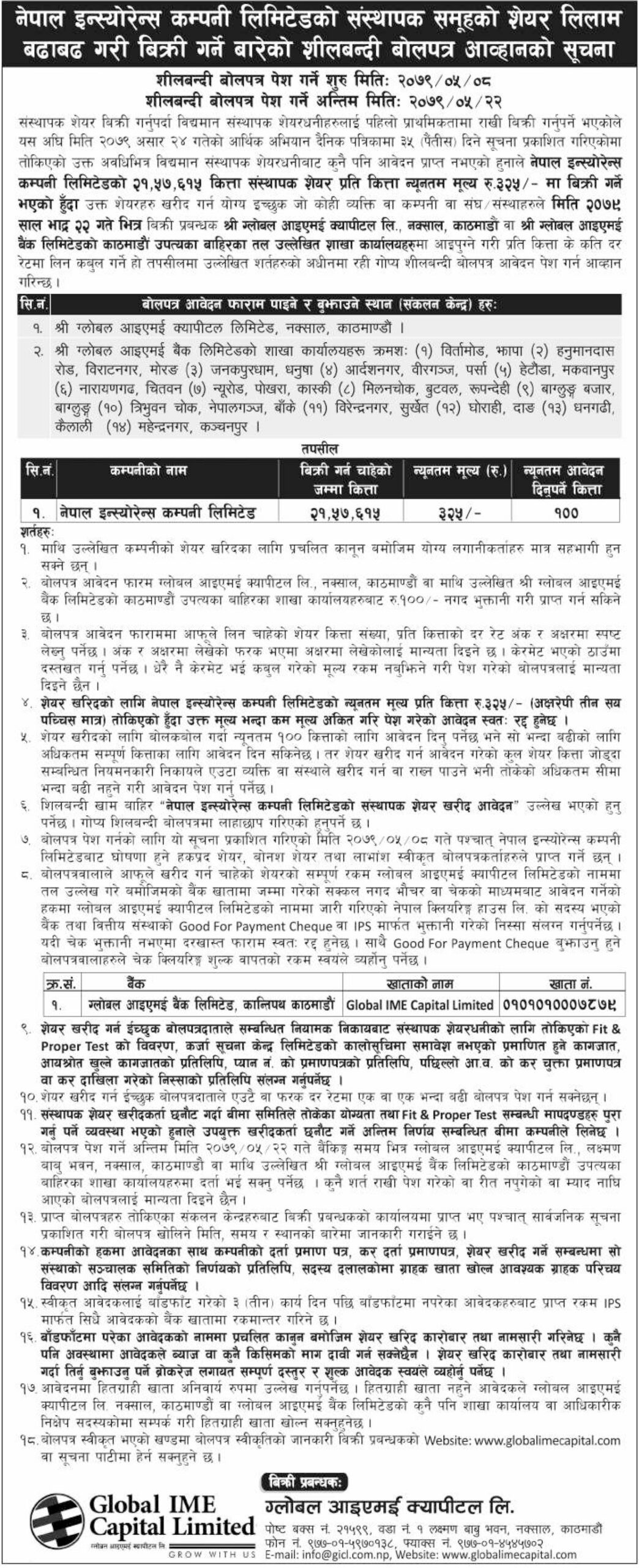 खरीद गर्न योग्य इच्छुक जो कोही व्यक्ति, कम्पनी वा संस्थाले उक्त संस्थापक शेयरमा भदौ २२ गतेभित्र विक्री प्रबन्धक ग्लोबल आइएमई क्पापिटल लिमिटेड नक्सालका साथै ग्लोबल आइएमई बैंक काठमाडौं उपत्यका बाहेक बाहिरका विभिन्न शाखा कार्यालयहरुमा शिलबन्दी बोलपत्र आवेदन पेश गर्न कम्पनीले आग्रह गरेको छ ।