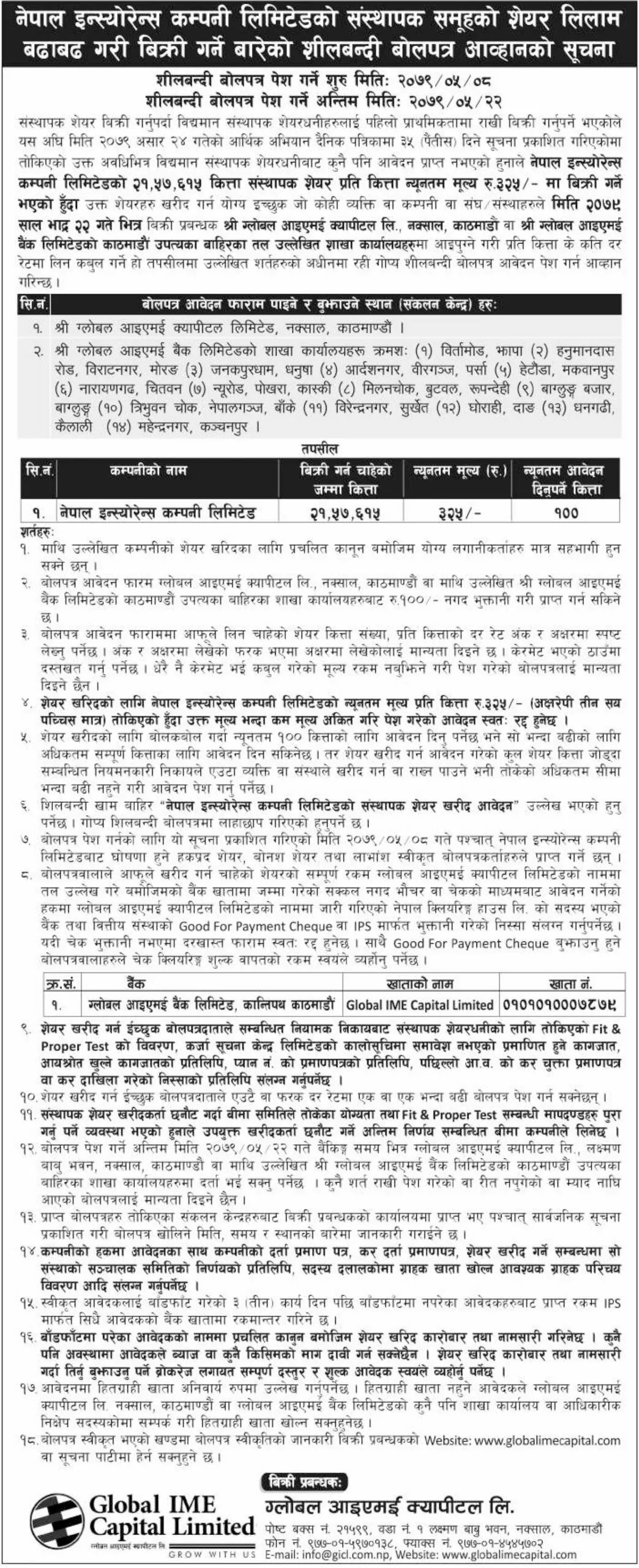 खरीद गर्न योग्य इच्छुक जो कोही व्यक्ति, कम्पनी वा संस्थाले उक्त संस्थापक शेयरमा भदौ २२ गतेभित्र विक्री प्रबन्धक ग्लोबल आइएमई क्पापिटल लिमिटेड नक्सालका साथै ग्लोबल आइएमई बैंक काठमाडौं उपत्यका बाहेक बाहिरका विभिन्न शाखा कार्यालयहरुमा शिलबन्दी बोलपत्र आवेदन पेश गर्न कम्पनीले आग्रह गरेको छ ।