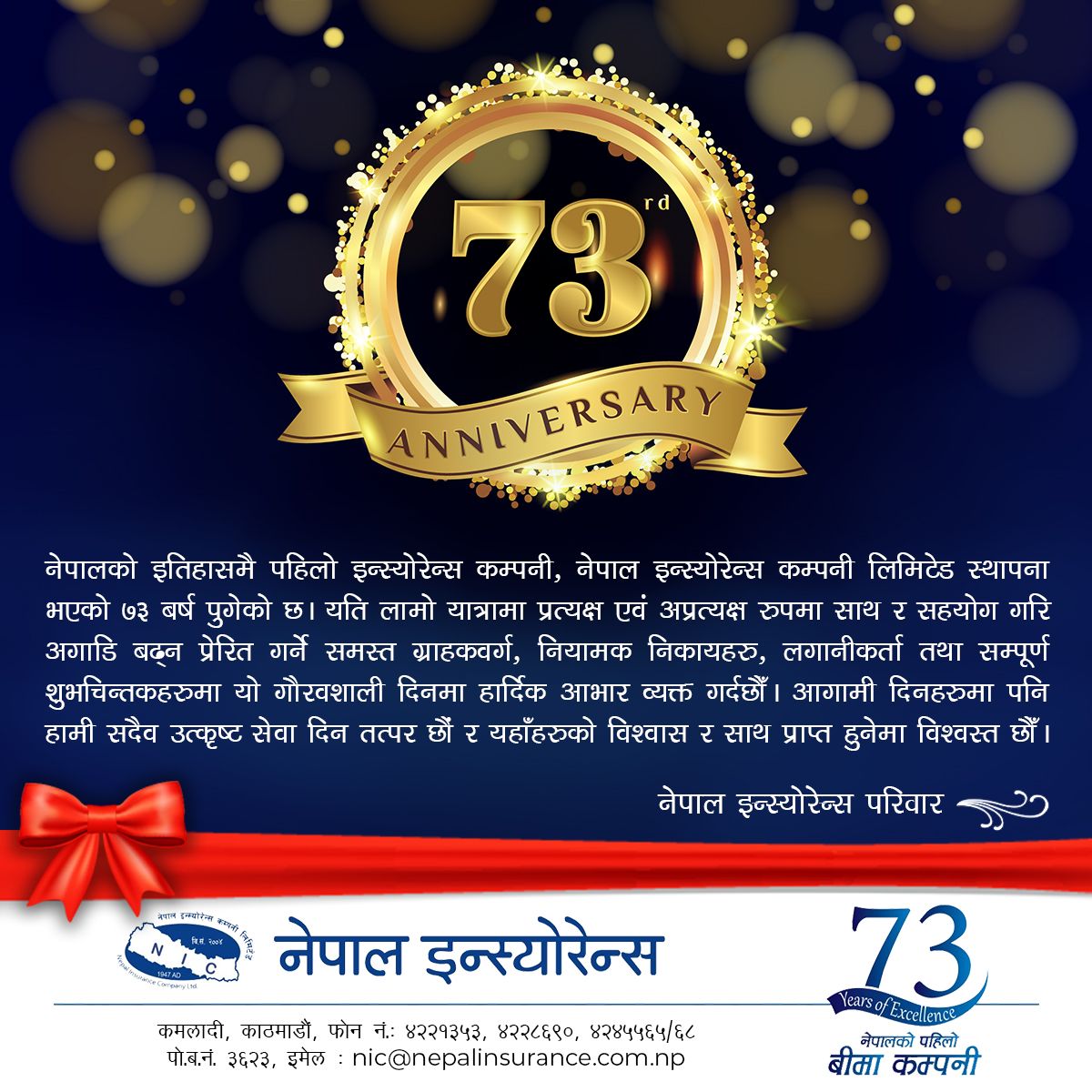 काठमाडौं । नेपाल इन्स्योरेन्स कम्पनी आफ्नो स्थापनाको ७३ वर्ष पुरा गरी ७४ बर्षमा प्रवेश गरेको छ । यस यात्रामा प्रत्यक्ष एवं अप्रत्यक्ष रुपमा साथ र सहयोग गरि अगाडि बढ्न प्रेरित गर्ने समस्त ग्राहकवर्ग, नियामक निकायहरु, लगानीकर्ता तथा सम्पूर्ण शुभचिन्तकहरुमा कम्पनीले हार्दिक आभार व्यक्त गरेको छ ।