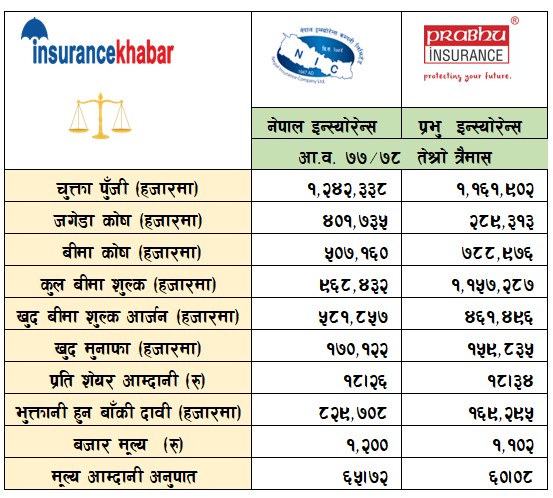 नेपाल इन्स्योरेन्सले चालु आर्थिक वर्षको तेश्रो त्रैमास सम्म १७ करोड ०१ लाख खुद नाफा गरेको छ भने प्रभु इन्स्योरेन्सले १५ करोड ९८ लाख खुद नाफा गरेको छ ।