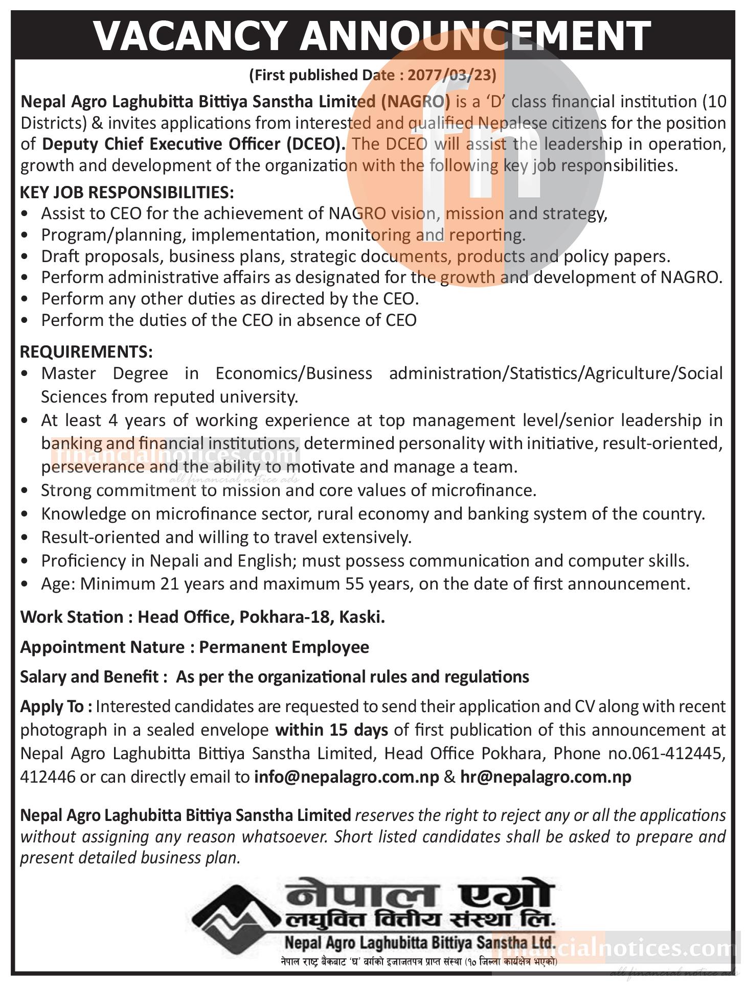 पोखरा । नेपाल एग्रो लघुवित्त वित्तीय संस्थाले कर्मचारीको माग गरेको छ । संस्थाले डिसिईओका लागि कर्मचारीको माग गरेको जनाएको छ । ईच्छुक तथा योग्यता पुगेकाले विज्ञापन प्रकाशित भएको मितिले १५ दिनभित्र आवेदन दिन सक्ने कम्पनीले जनाएको छ ।